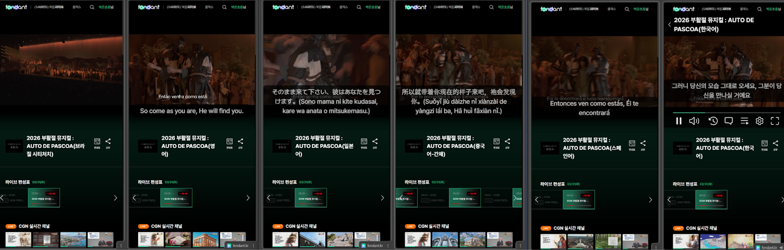 이번 행사는 포르투갈어로 진행된 뮤지컬이었으나, 시청자들은 언어 장벽 없이 라이브를 즐길 수 있었습니다. 파트너사 ‘둡(dooub)’의 AI 번역 엔진인 Subsy를 라이브 스트리밍 소스에 직접 연동했습니다. 이를 통해 포르투갈어 음성을 인식하고, 한국어, 영어, 일본어, 중국어, 스페인어 등 5개 국어의 준실시간 번역 자막을 스트림에 동기화하여 글로벌 OTT 수준의 다국어 서비스 환경을 구현했습니다.