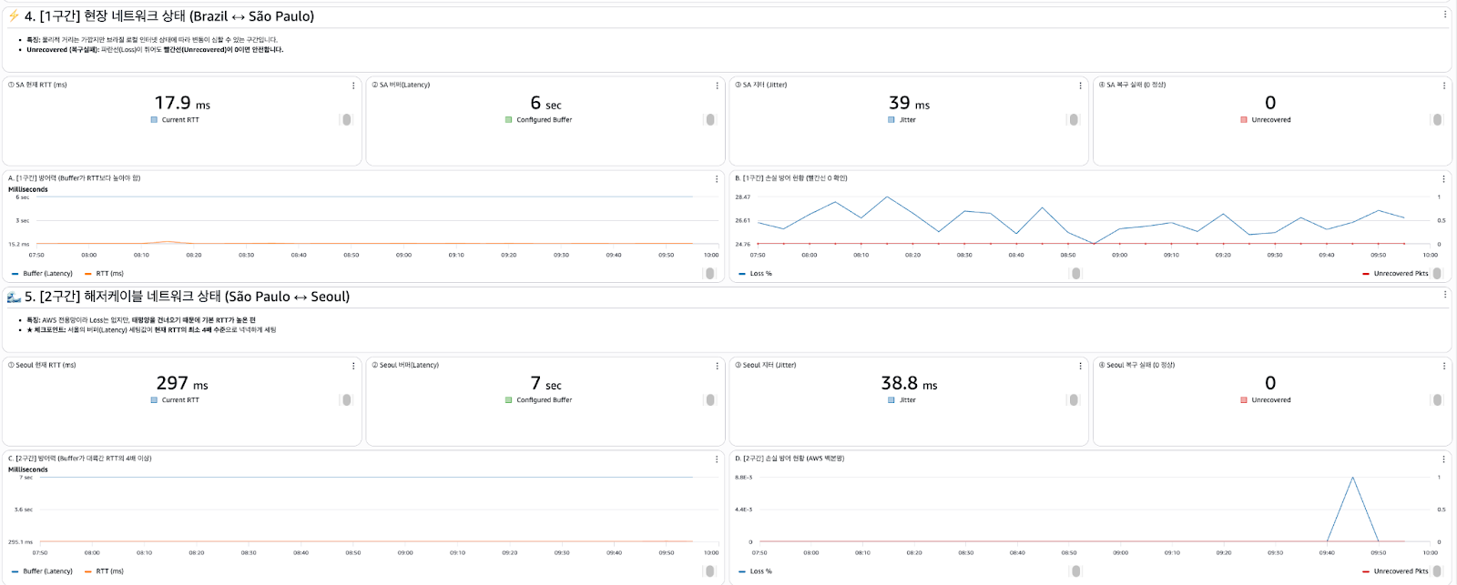 CloudWatch 기반의 대시보드를 구축하여 Input Loss, RTT(Round Trip Time), Unrecovered Packet 등의 핵심 지표를 실시간 시각화했습니다.
