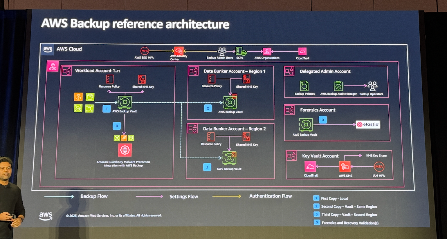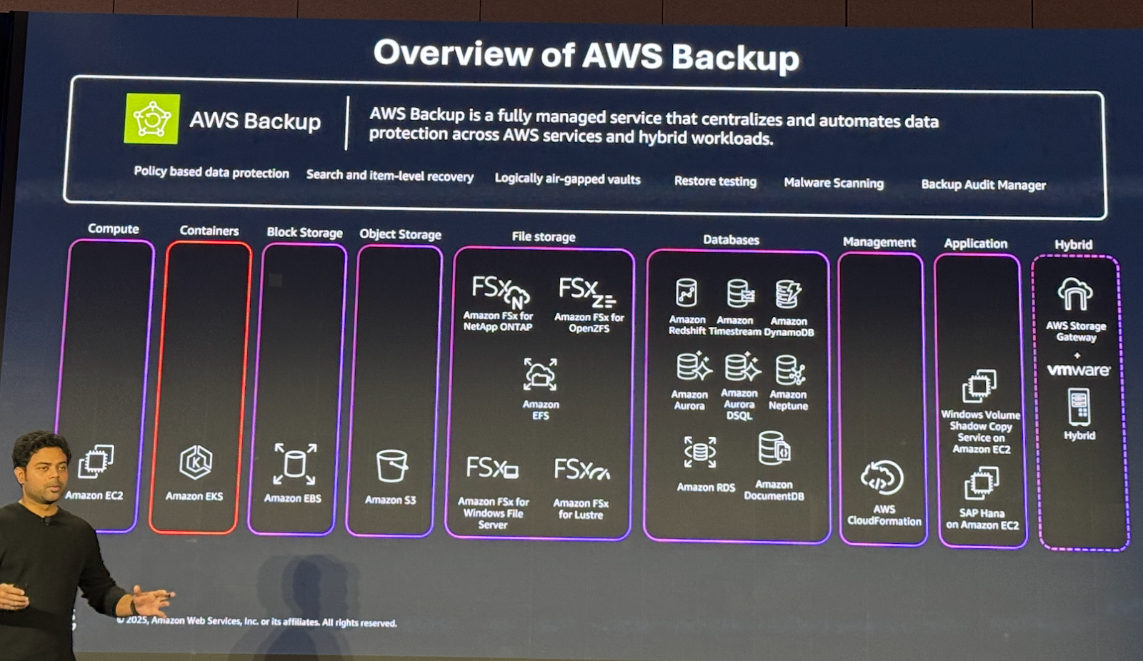 특히 발표 자료에서 강조된 네 가지 핵심 기능은 AWS Backup이 단순한 스냅샷 관리 도구를 넘어 기업 운영의 필수 보안/무결성 계층으로 확장되었음을 잘 보여줍니다.