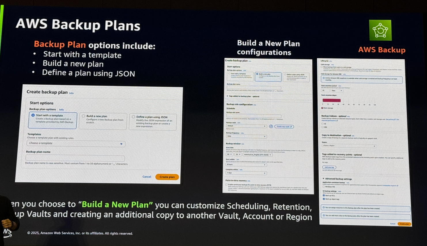 Build a new Plan(새 백업 플랜)을 생성하면백업 스케줄, 보존 정책, 백업 볼트, 그리고 다른 볼트·계정·리전에 대한 추가 복제본까지 자유롭게 설정할 수 있습니다.