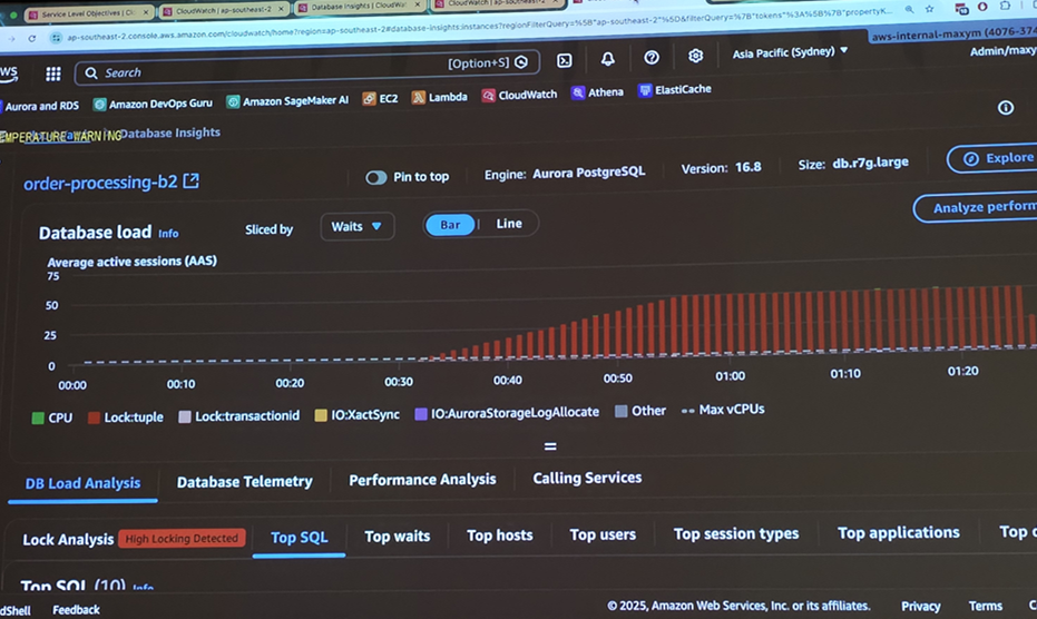 여러 세션이 client wait, lock wait 상태로 이어지며, 하나의 장기 실행 세션이 전체 경합을 유발하는 전형적인 패턴이 Database Insights를 통해 명확히 드러났습니다.