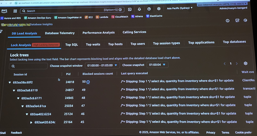 Database Insights의 Session / Lock Tree 기능을 활용해 세션 간 대기 관계와 락 체인을 분석하는 과정이 시연되었습니다.