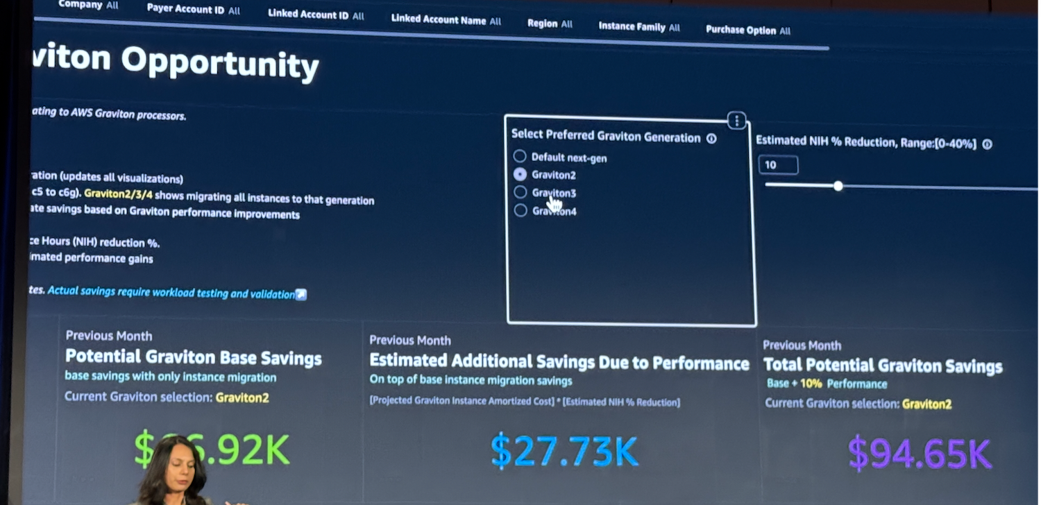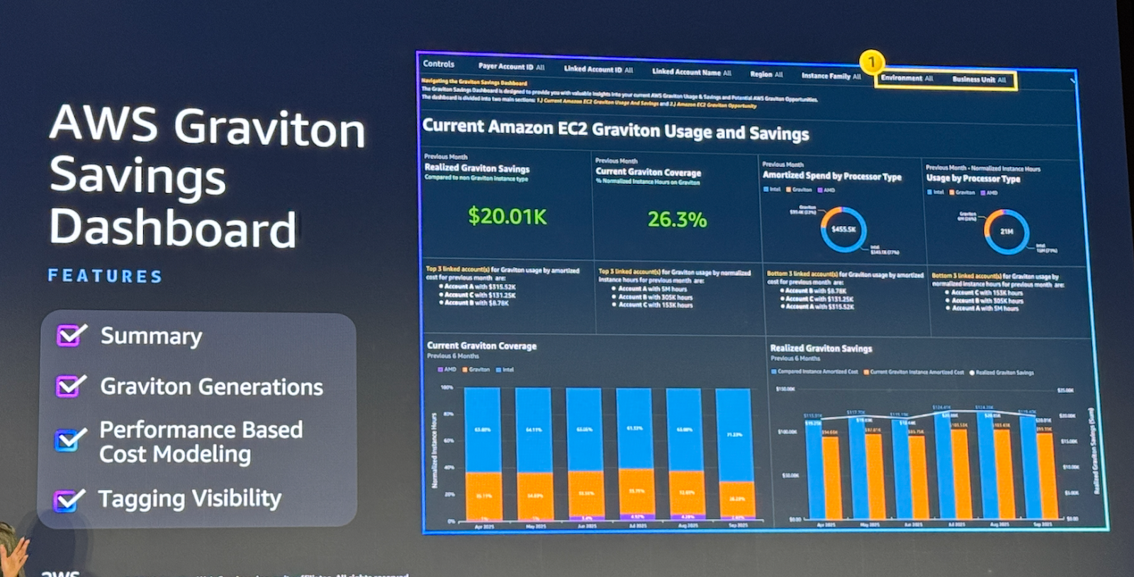 이 도구는 Graviton 전환의 현재 상태와 잠재적 절감 기회를 한눈에 보여주는 “현대적 클라우드 비용 GPS” 역할을 수행합니다. 이번 세션에서는 대시보드가 현재 위치와 절감 가능성을 명확히 알려주는 시스템이라 설명하며, Graviton 채택 여정을 데이터 기반으로 가속할 수 있음을 강조했습니다.