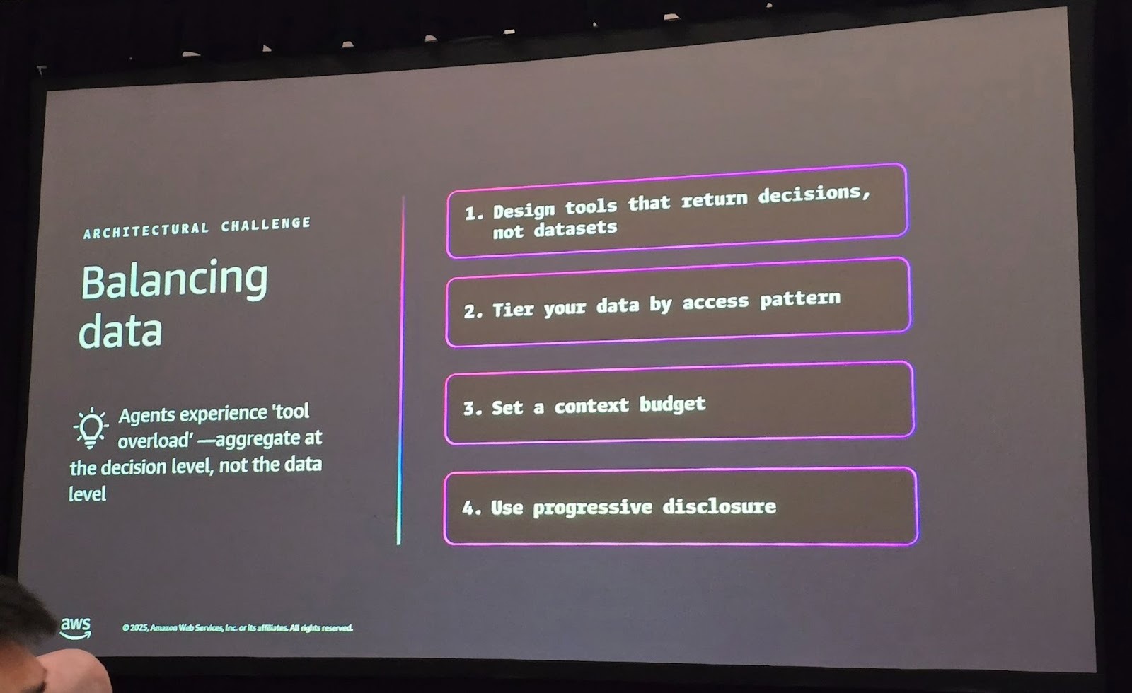 - 접근 패턴에 따른 데이터 계층화: 실시간 입찰가 같은 ‘Hot Data’는 툴 호출로, 잘 변하지 않는 ‘Cold Data’는 시스템 프롬프트나 캐시로 관리합니다.