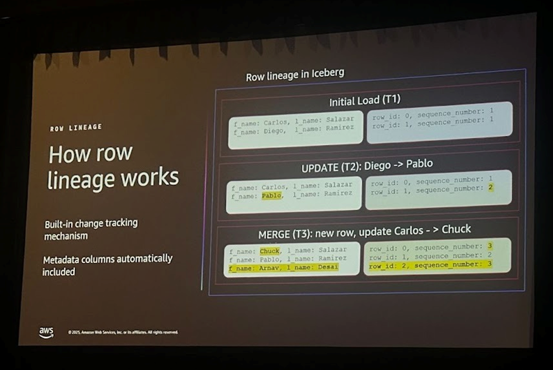 Row Lineage는 Iceberg v3에서 도입된 레코드 단위로 변경사항을 추적할 수 있는 기능으로, 각 행에 row_id와 sequence_number를 자동으로 부여해 변경 이력을 관리할 수 있도록 지원합니다. 이 정보는 숨겨진 컬럼 형태로 테이블에 저장됩니다. 변경되는 메타데이터가 데이터 레코드와 함께 저장되기 때문에 스냅샷과 데이터 레코드 상태 정보의 불일치 문제를 줄이고, 시간여행(Time Travel) 시점에도 해당 시점의 변경 이력을 그대로 확인할 수 있습니다.