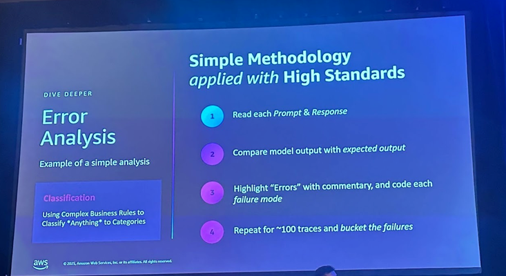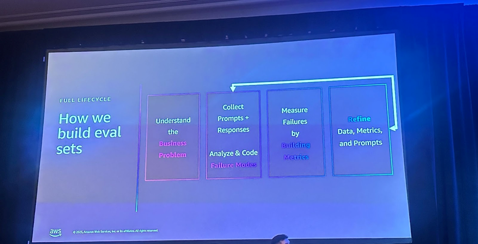 평가 시스템 구축의 첫 단계는 고객과의 협업입니다. 아마존 내부 고객뿐만 아니라 다양한 외부 고객과 협력하여, 모델을 통해 달성하고자 하는 목표와 비즈니스 요구사항을 명확히 정의합니다. 그 후 고객이나 파트너로부터 데이터를 확보하거나 외부에서 수집하고, 이를 기반으로 평가 세트를 구성합니다. 이 세트는 매일, 매주, 혹은 월 단위로 반복적으로 실행되며, 모델의 성능을 지속적으로 모니터링합니다. 이렇게 수집된 데이터와 결과는 학습 데이터 개선과 애플리케이션용 프롬프트 최적화에 활용됩니다.
