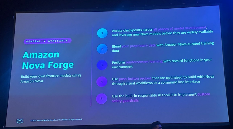 기업별 맞춤형 성능 향상이 필요하다는 요구가 지속적으로 제기됨에 따라 Nova Forge가 공개되었습니다. Nova Forge는 조직에 맞춘 맞춤형 모델을 손쉽게 구축할 수 있는 플랫폼으로 기초 모델뿐만 아니라 특정 업무에 최적화된 작업 모델도 제작할 수 있습니다. 이 플랫폼은 데이터 혼합, 강화 학습, 미세 조정, 지도 학습 기반 미세 조정, 지속적 사전 학습 등 다양한 기능을 통합합니다.