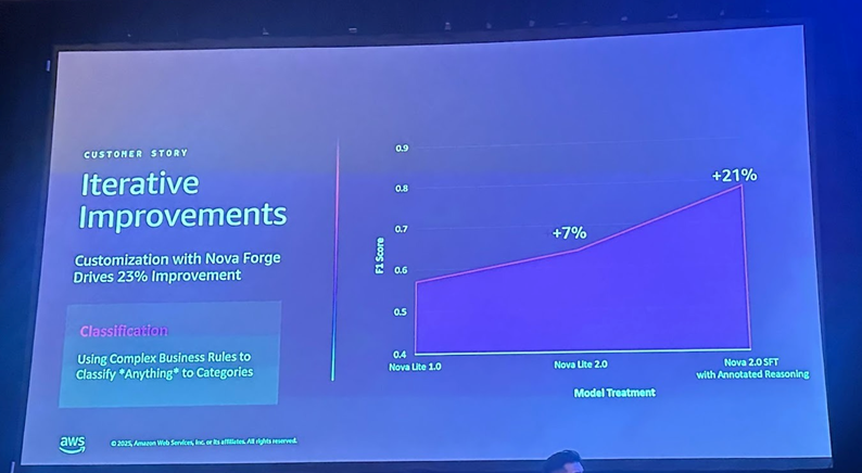 앞서 소개된 분류 사례를 Nova Forge를 활용해 개선한 실험에서는 기준선 대비 7% 향상을 보인 Nova 2 Lite에 추가로 미세 조정을 적용함으로써 최대 21% 성능 개선이 확인되었습니다. 이를 통해 기업은 실제 업무에 맞춘 최적화된 맞춤형 AI 모델을 신속하게 구축할 수 있으며, 분류 기반 업무가 중요한 산업에서 실질적인 비즈니스 가치를 창출할 수 있습니다.
