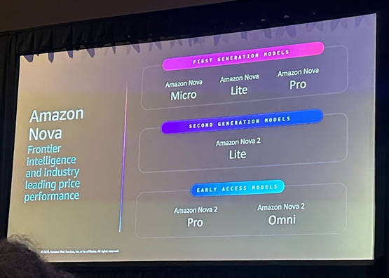 Nova Forge를 통해 개발할 수 있는 모델로는 작년에 소개된 모델, 어제 발표된 Nova 2 모델, 그리고 프리뷰 중인 Nova Lite 모델이 있습니다. 이 모델들은 산업 벤치마크에서 뛰어난 성능을 보여주며, 기업은 이를 기반으로 고유 데이터를 결합해 맞춤형 모델을 구축할 수 있습니다.