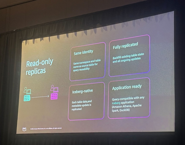 S3 Tables는 Iceberg 기반 데이터레이크를 쉽게 멀티 리전으로 확장할 수 있도록 읽기 전용 복제본(Read-Only Replica)을 제공합니다.