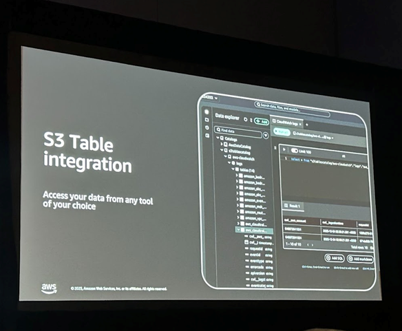 몇 번의 클릭만으로 CloudWatch 데이터를 S3 Tables와 연동할 수 있으며, Iceberg 테이블 포맷을 지원하여 SageMaker Unified Studio 등 다양한 분석 도구에서 즉시 쿼리하고 활용할 수 있습니다.