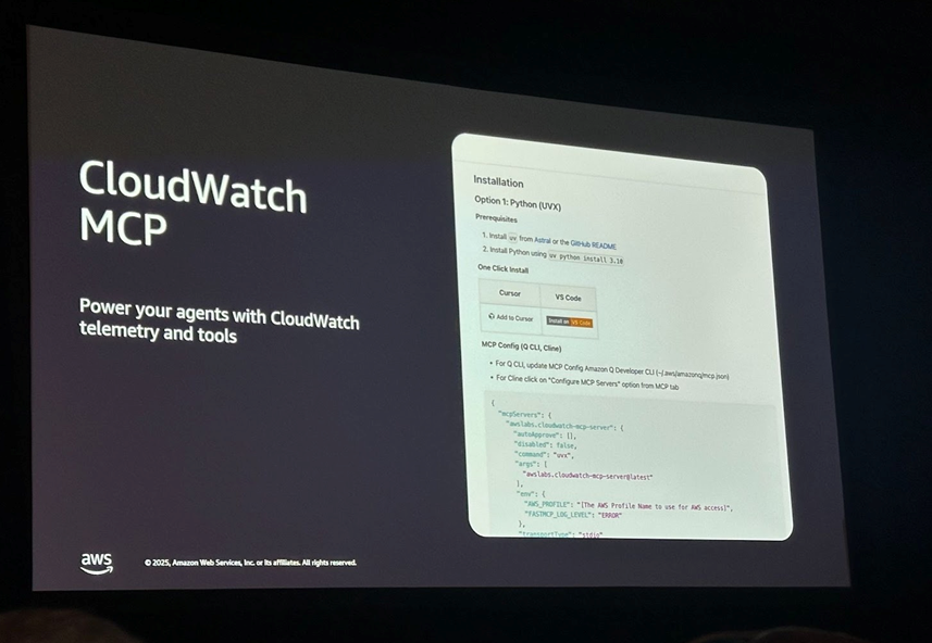 특수 에이전트 구축이나 기존 에이전트와 통합을 지원하며, Application Signals MCP 서버와 연결 시 지연 오류나 SLO 위반의 정확한 파일, 함수, 코드 라인을 신속히 식별할 수 있습니다.