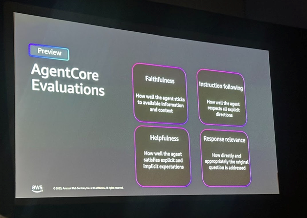 3개의 사전 구축된 평가 지표(Evaluators)와 사용자 정의 기준을 활용해 모델의 품질을 자동으로 측정하고 모니터링할 수 있습니다. 모든 데이터는 CloudWatch 통합 대시보드에서 확인 가능하며, 세션 기반 추적과 프롬프트-응답 상호작용 분석으로 에이전트와 사용자 상호작용을 세밀하게 모니터링하고 문제를 신속히 파악할 수 있습니다.