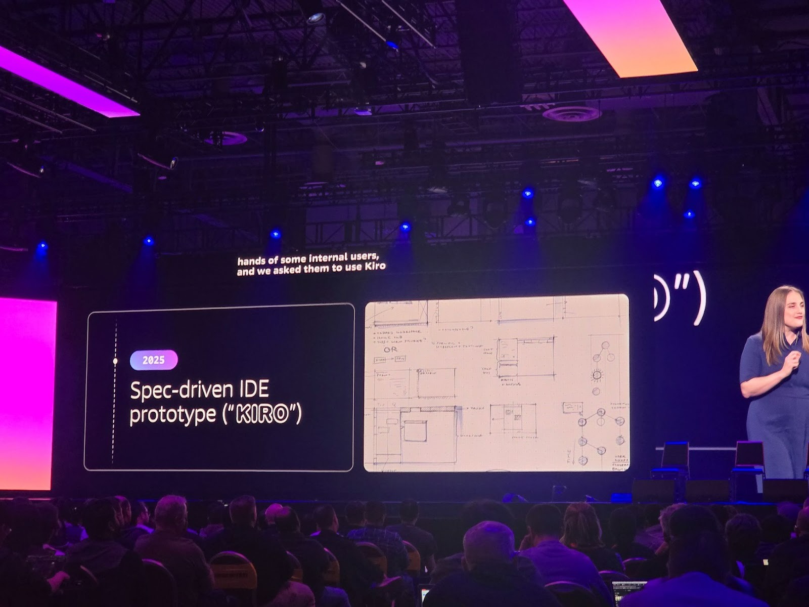 AWS의 Clare Liguori Principal Engineer가 무대에 올라 새로운 IDE인 Kiro를 발표했습니다.