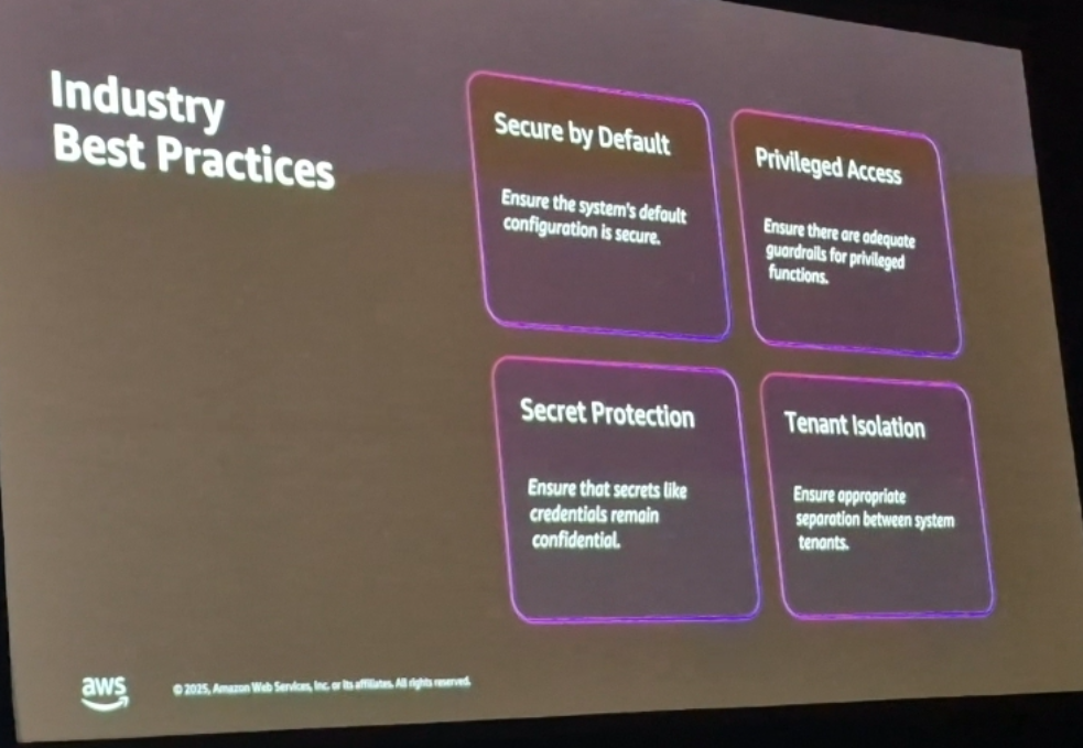 특히 주목할 만한 예는 IAM 통합 라이브러리입니다. AWS의 모든 서비스는 IAM과 통합되어야 하는데, 자동화된 추론 기반의 검증된 라이브러리를 출시했다고 합니다. 발표자는 이것이 팀이 정확하고 빠르게 작업할 수 있도록 내부적으로 개발한 핵심 보안 기본 요소라고 설명했습니다. AWS Security Agent가 모든 서비스 팀이 이 라이브러리를 사용하도록 보장하는 메커니즘 역할을 한다는 점이 흥미로웠습니다.