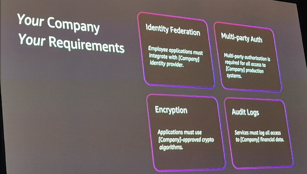 두 번째 유형은 회사별 요구사항입니다. 업계 도메인, 운영 국가, 회사 정책에 따라 달라집니다. 조직마다 애플리케이션 액세스 권한 부여 방식, 민감한 리소스에 대한 다자 승인, 특정 암호화 요구사항, 감사 로깅 규칙 등 다른 요구사항이 있을 수 있습니다.