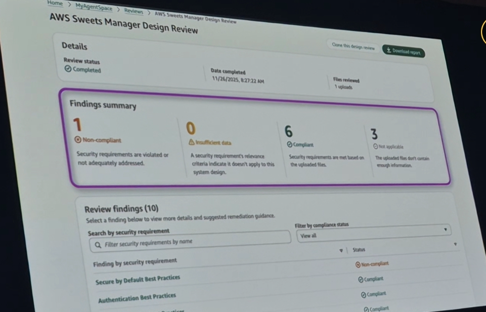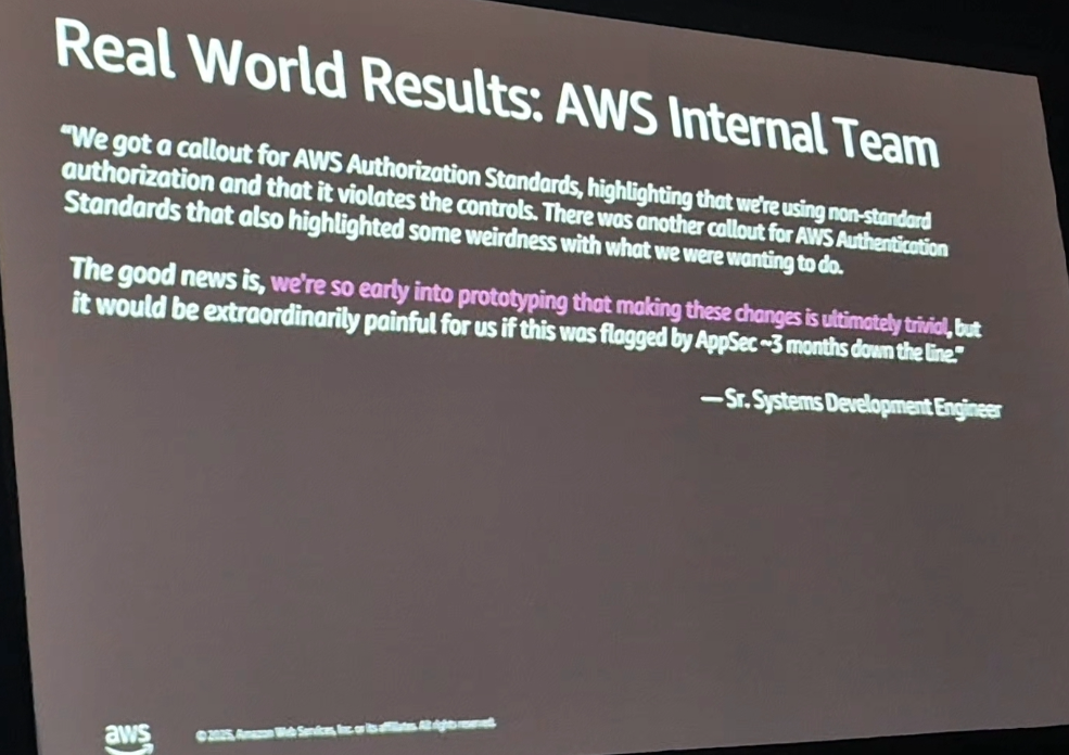 또한 AWS가 지난 몇 개월 동안 내부적으로 이 Security Agent를 사용했던 사례에 대해 발표해주었습니다. 발표자는 AWS도 자체 내부 보안 요구사항이 많이 있으며, Security Agent를 사용하여 이러한 요구사항을 포착하고 개발자의 속도를 높여왔다고 밝혔습니다.