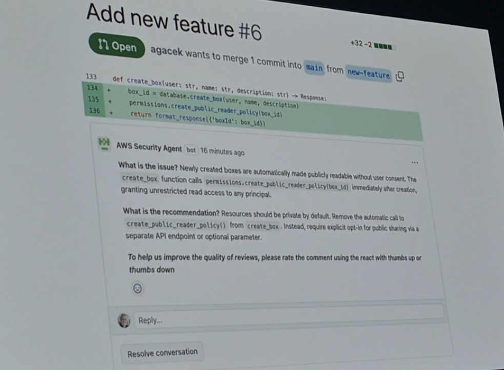 발표자는 개발자가 설계 검토 없이 바로 코딩을 시작하는 경우를 예로 들었습니다. 코딩 어시스턴트를 사용하면 시작하기가 더욱 쉬워졌지만, Security Agent가 풀 리퀘스트를 읽고 기본적으로 안전하지 않은 구성을 자동으로 플래그한다고 합니다.