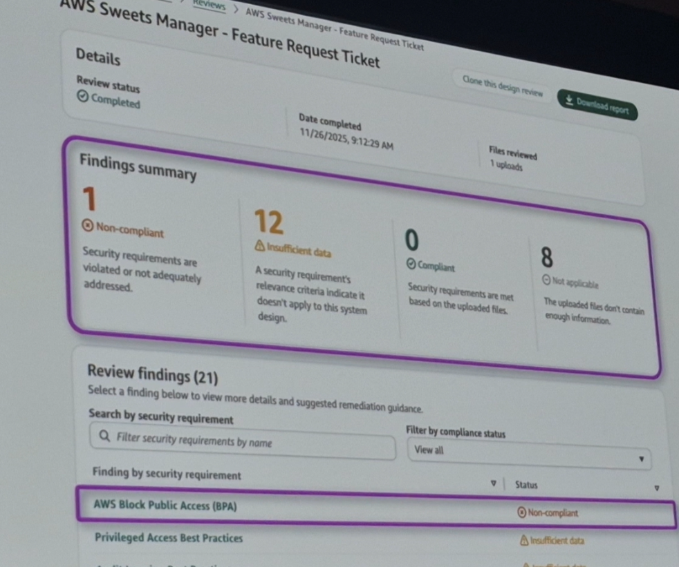Security Agent에 업로드해보니, 대부분의 보안 요구사항은 적용되지 않거나 데이터가 충분하지 않았지만, 보안 요구사항 중 하나가 이미 준수되지 않았습니다. Block Public Access입니다. AWS는 모든 새로운 리소스 기반 정책이 Block Public Access를 요구합니다. S3를 사용하는 경우 한 번의 클릭으로 켤 수 있어 리소스가 공개되지 않도록 보장할 수 있습니다. 모든 새 리소스 정책이 이를 지원하는 것이 요구사항입니다.