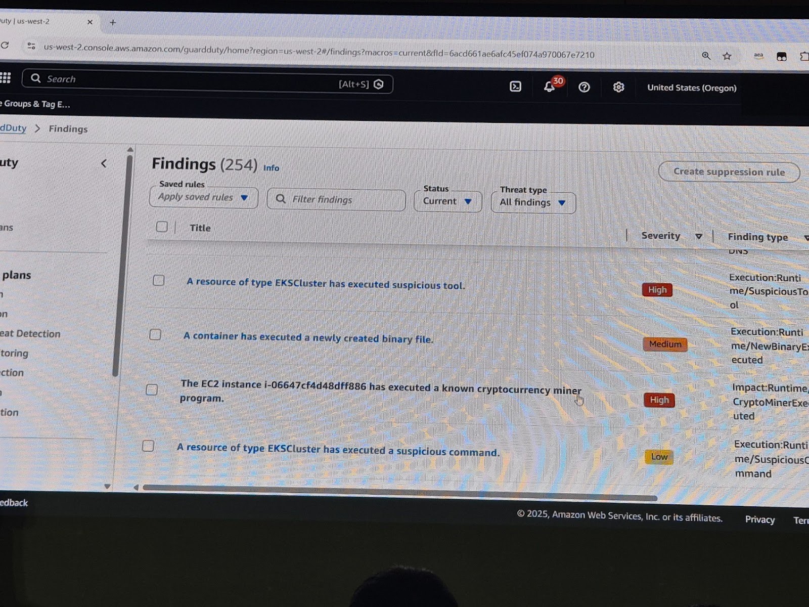 공격 시나리오 실행 후 GuardDuty 콘솔의 Findings 섹션을 확인하면 여러 개의 탐지 결과를 볼 수 있습니다.