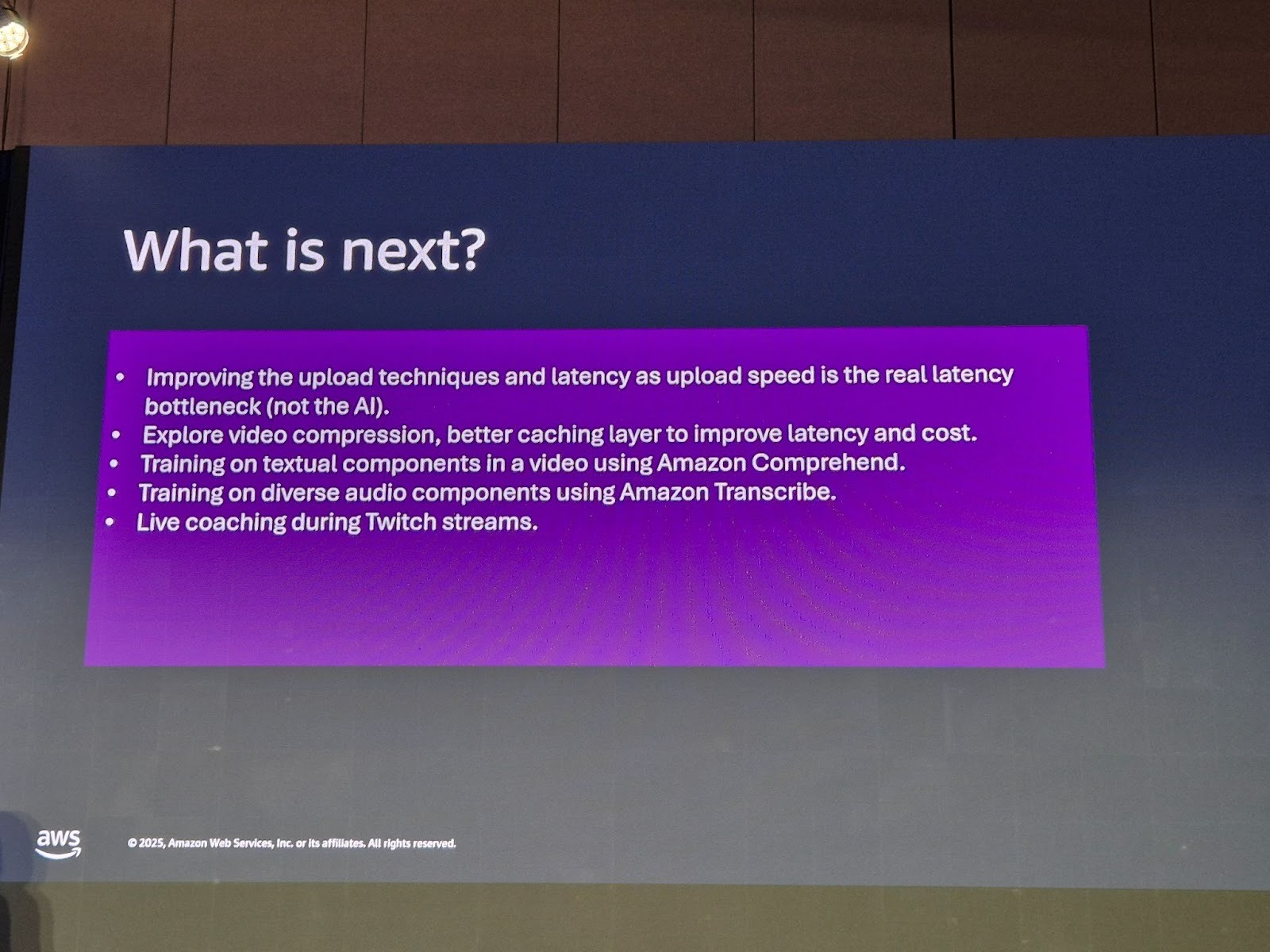 이 GenAI 게임 코치 시스템은 멀티모달 데이터(영상, 음성, 텍스트)와 AWS의 AI/ML 서비스(Bedrock, Rekognition, Transcribe, Comprehend)를 결합하여 게이머들에게 개인화되고 실용적인 피드백을 제공함으로써 실력 향상이라는 난제를 해결할 수 있음을 보여주었습니다.향후 과제로는 지연 시간 개선이 가장 중요하며, 특히 AI 분석보다 병목 현상인 업로드 속도를 개선하는 기술을 모색하고, 비디오 압축 및 캐싱 기술을 탐구할 계획입니다. 또한, Twitch나 YouTube 같은 라이브 스트리밍 플랫폼에서도 실시간 코칭을 제공할 수 있도록 확장하는 것이 목표입니다. 이러한 시스템은 게이머들이 더 이상 혼자서 실수에 좌절하지 않고, 항상 옆에서 도와주는 개인 코치를 갖게 될 미래를 제시합니다.