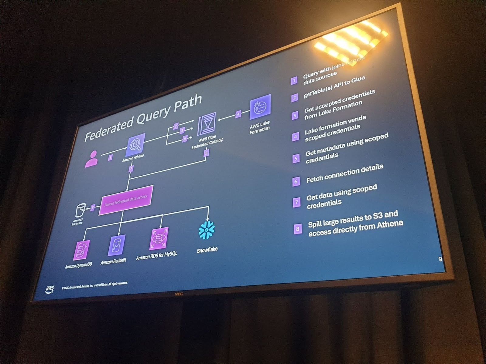 워크숍에서는 소매 사용 사례를 바탕으로 S3 카탈로그와 Redshift 카탈로그를 생성하고, Aurora MySQL과의 연결을 생성했습니다. Zero ETL 통합을 통해 Aurora MySQL 데이터를 Redshift로 가져오고, Athena와 Redshift 두 시스템에 걸쳐 페더레이션 쿼리를 실행했으며, 변경 데이터 캡처(CDC) 시나리오도 다뤘습니다.