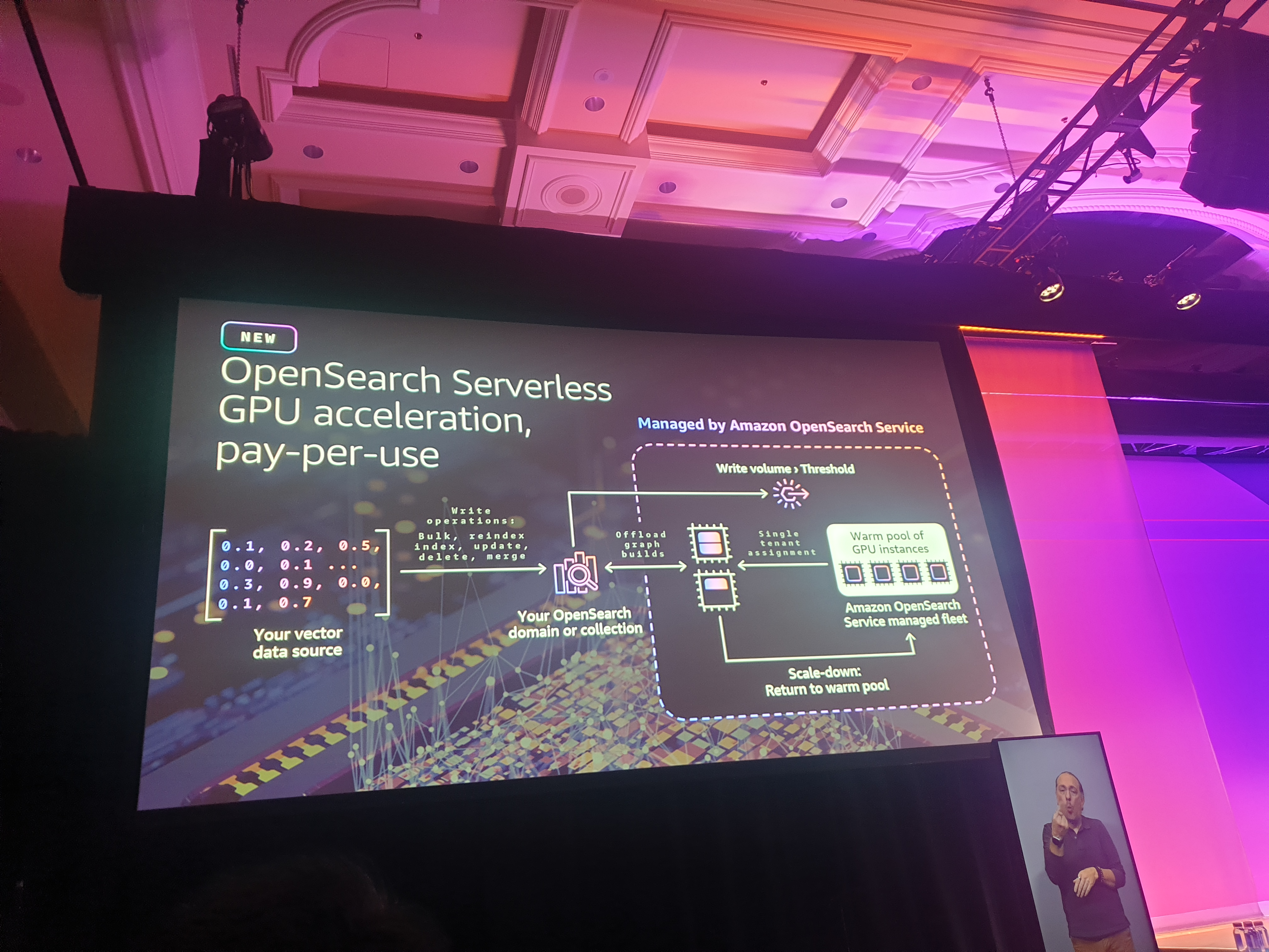 OpenSearch에도 많은 AI 기능을 추가했습니다. GPU 가속화로 10억 규모 벡터 데이터베이스를 1시간 이내에 구축하고, 벡터를 10배 빠르게 인덱싱하며, 비용은 1/4로 줄었습니다. OpenSearch Serverless의 GPU 가속화는 완전 서버리스로 GPU 인스턴스를 관리할 필요가 없고 사용한 만큼만 지불합니다.
