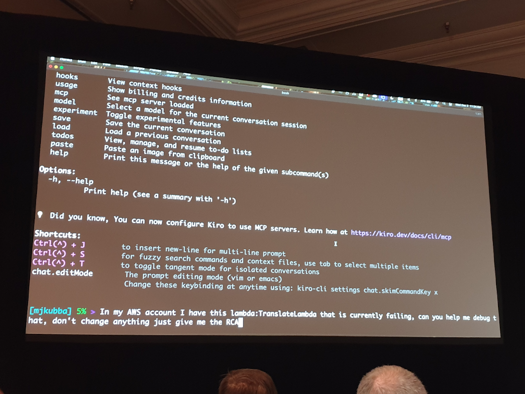 세션에서는 실제 데모를 통해 Kiro CLI의 강력함을 보여줬습니다. Kiro CLI는 자연어로 질문하면 적절한 명령어를 생성하고 실행합니다. 예를 들어 “현재 헬스 체크에 실패하는 마이크로서비스가 무엇인지 찾아줘”라고 입력하면 Kiro는 AWS CLI를 호출하여 관련 정보를 찾고 분석합니다.