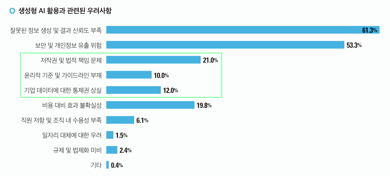 리포트에 따르면 향후 2~3년 내 기업이 가장 크게 우려할 요소로 ‘저작권 등 법적 책임(21.0%)’과 ‘전사적 통제(거버넌스) 체계 부재’가 꼽혔습니다.