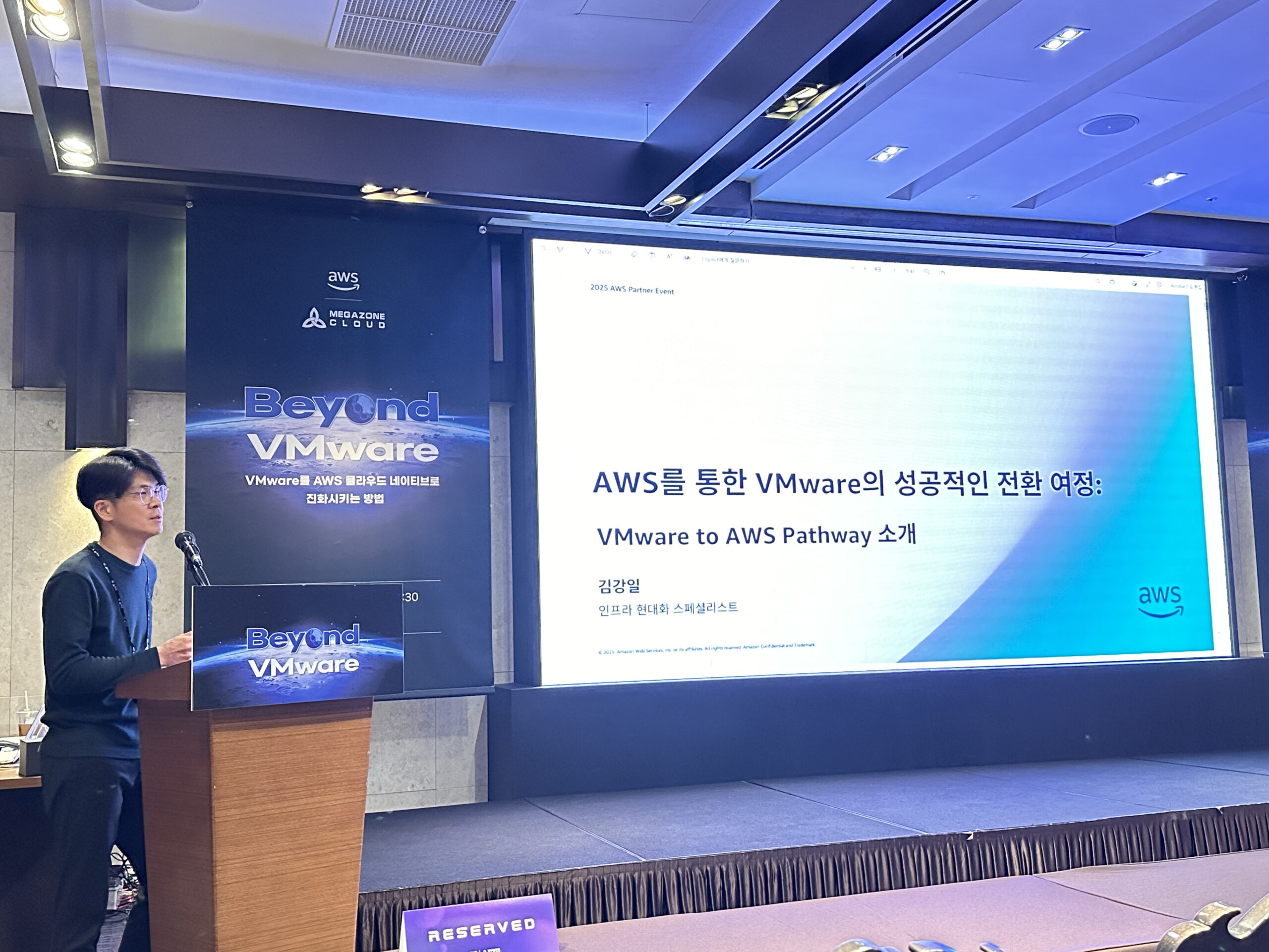이어서 AWS 인프라 현대화 스페셜리스트 김강일님이 발표를 맡아, VMware 환경을 AWS로 전환하는 구체적인 경로와 방법론을 중심으로 진행되었습니다.