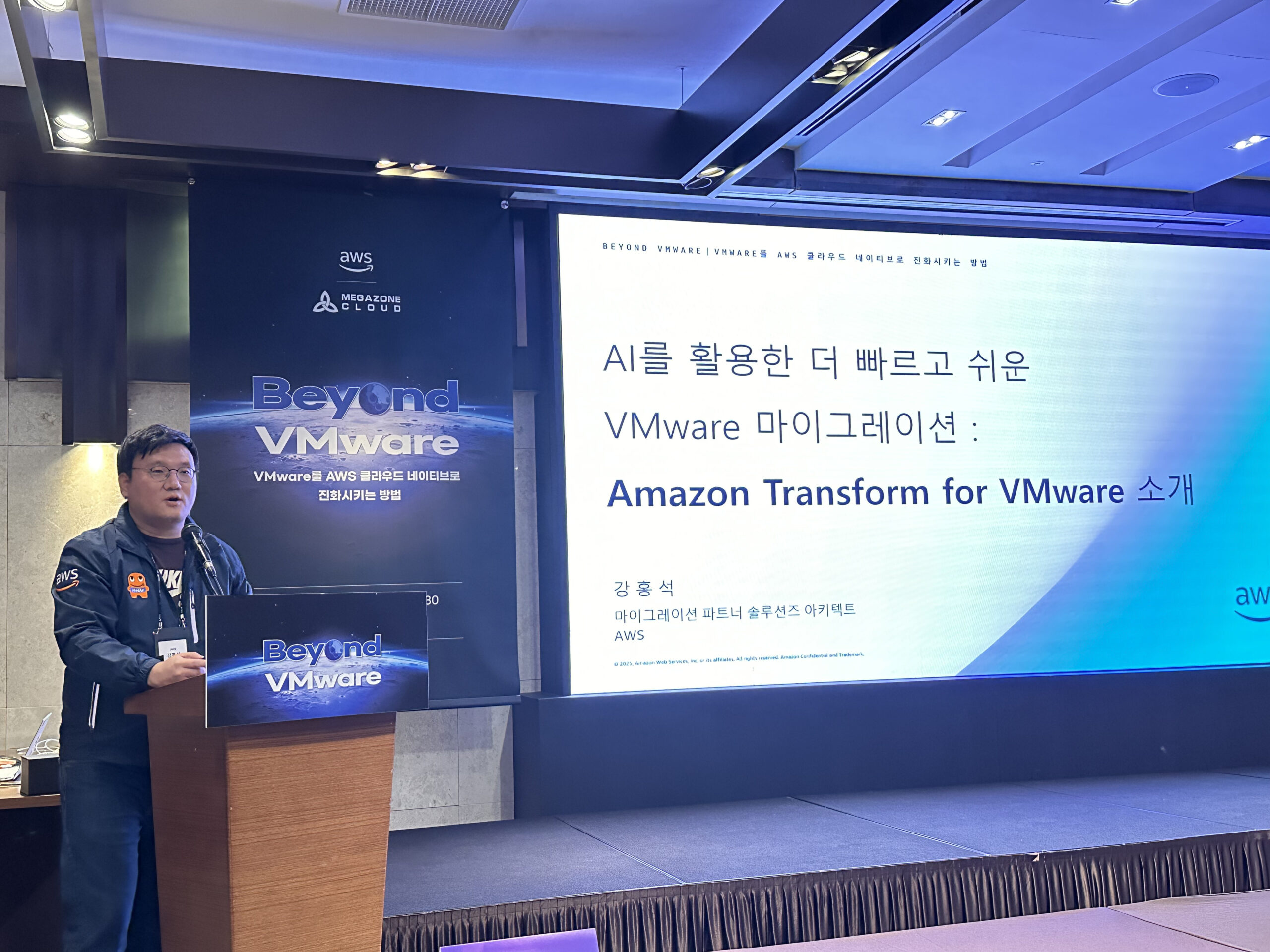 그 다음 세션은 AWS 마이그레이션 파트너 솔루션즈 아키텍트 강홍석님이 AI 기반 자동화를 통해 VMware 환경을 AWS 클라우드 네이티브로 빠르고 효율적으로 전환하는 방법을 소개했습니다.